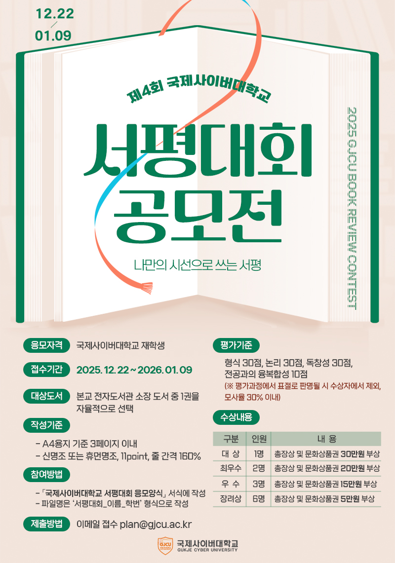 | 제목 | 제4회 국제사이버대학교 서평대회 공모전 | 25.12.18 |